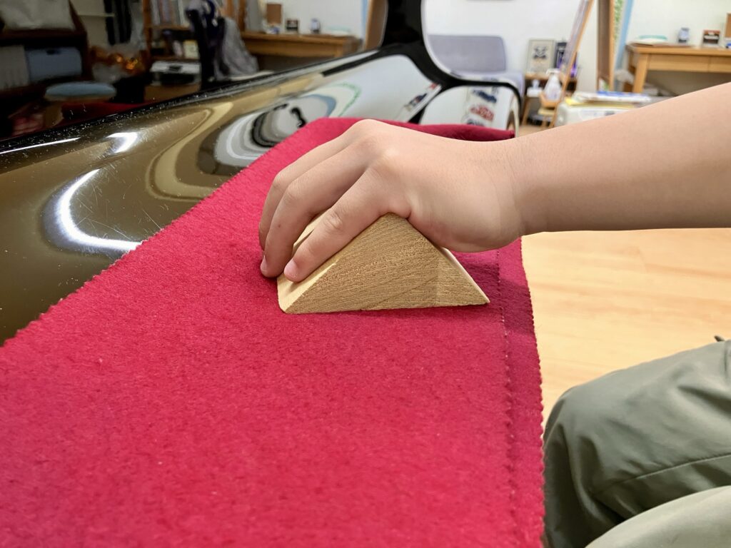 ふたの上で関節出す練習して、そのままそーっとピアノに移動するけど、やっぱり力がガチガチに入ってしまう時には三角積み木の上にどで〜んと手を乗せます。
