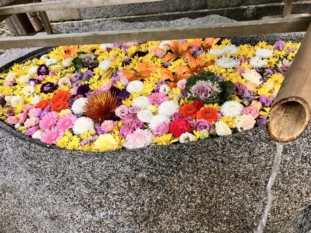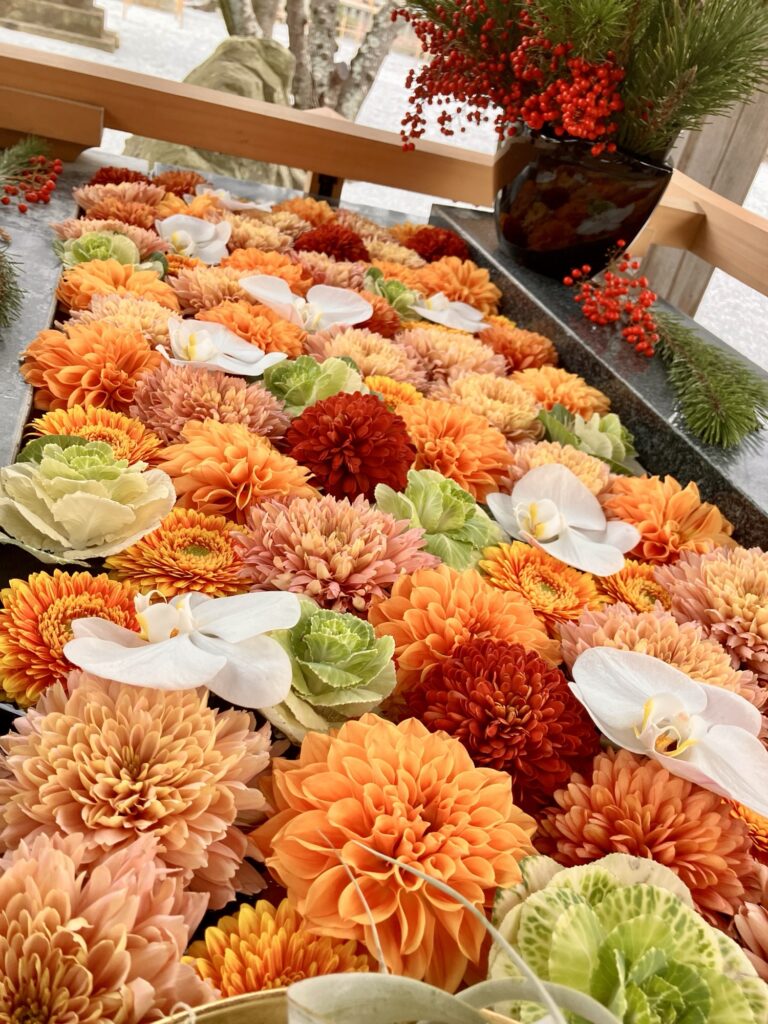 いつもキレイなお花で飾ってある手水舎もお正月雰囲気たっぷり。