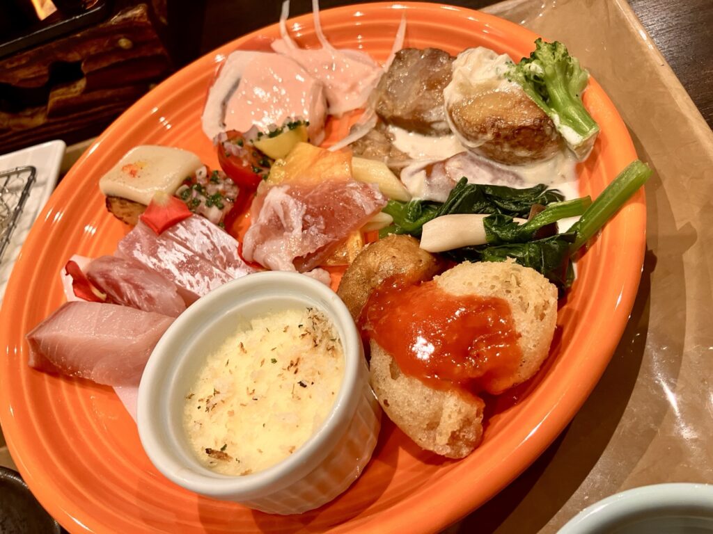 お刺身からステーキまで、黄色い泡の飲み物と一緒におなかいっぱいいただきました。