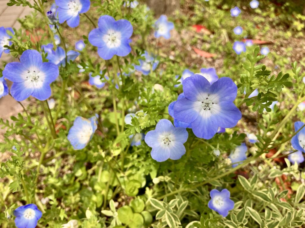 こぼれ種のネモフィラたちは小さいけれど、あちらこちらで健気に咲き。