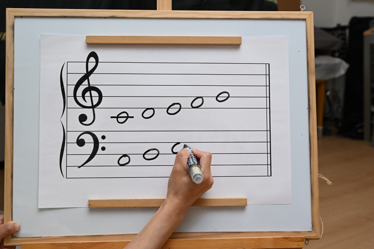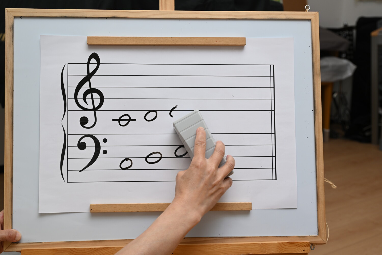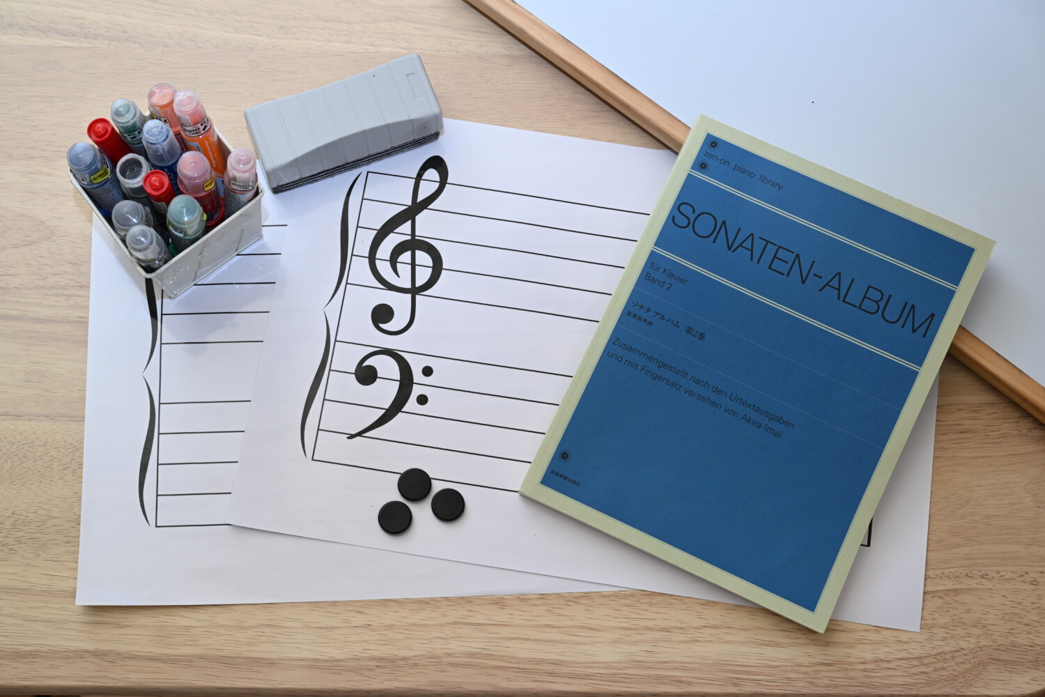 場所を問わずどこでも使えるホワイトボードタイプの大譜表です。